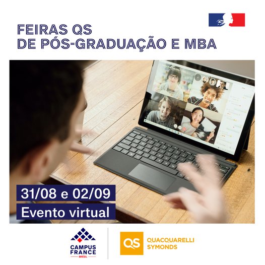 Trata-se de uma oportunidade de conversar com representantes de algumas das melhores instituições de ensino francesas. Nos dias 31 de agosto e 2 de setembro de 2021 acontecerá, virtualmente, mais uma edição das feiras QS de pós-graduação e MBA. As feiras são organizadas pela empresa QS Quacquarelli Symonds, responsável pela publicação de alguns dos mais respeitados rankings universitários do mundo.
