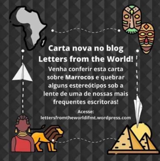 A iniciativa educacional do IFMT Campus Barra do Garças denominada “Letters from the World” é um blog em que são e serão postadas cartas de pessoas do mundo todo contando sobre as suas experiências. A atividade foi desenvolvida por meio de auxílio do Edital 17/2020 – PROEX. Tais relatos costumam ser escritos no idioma do país originário para, posteriormente, serem traduzidos e/ou revisados por um grupo de voluntários ligados à Área Internacional do IFMT Campus Barra do Garças.