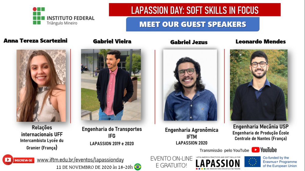 O conteúdo produzido e compartilhado aqui visa promover experiências internacionais educativas sem financiamento pelo IFMT. O evento “LAPASSION DAY: SOFT SKILLS IN FOCUS” ocorrerá no dia 11 de novembro, das 18h às 20h (horário de Brasília – Brasil). O evento será realizado em língua inglesa com tradução concomitante para Português e LIBRAS. Não há pré-requisitos para a participação.